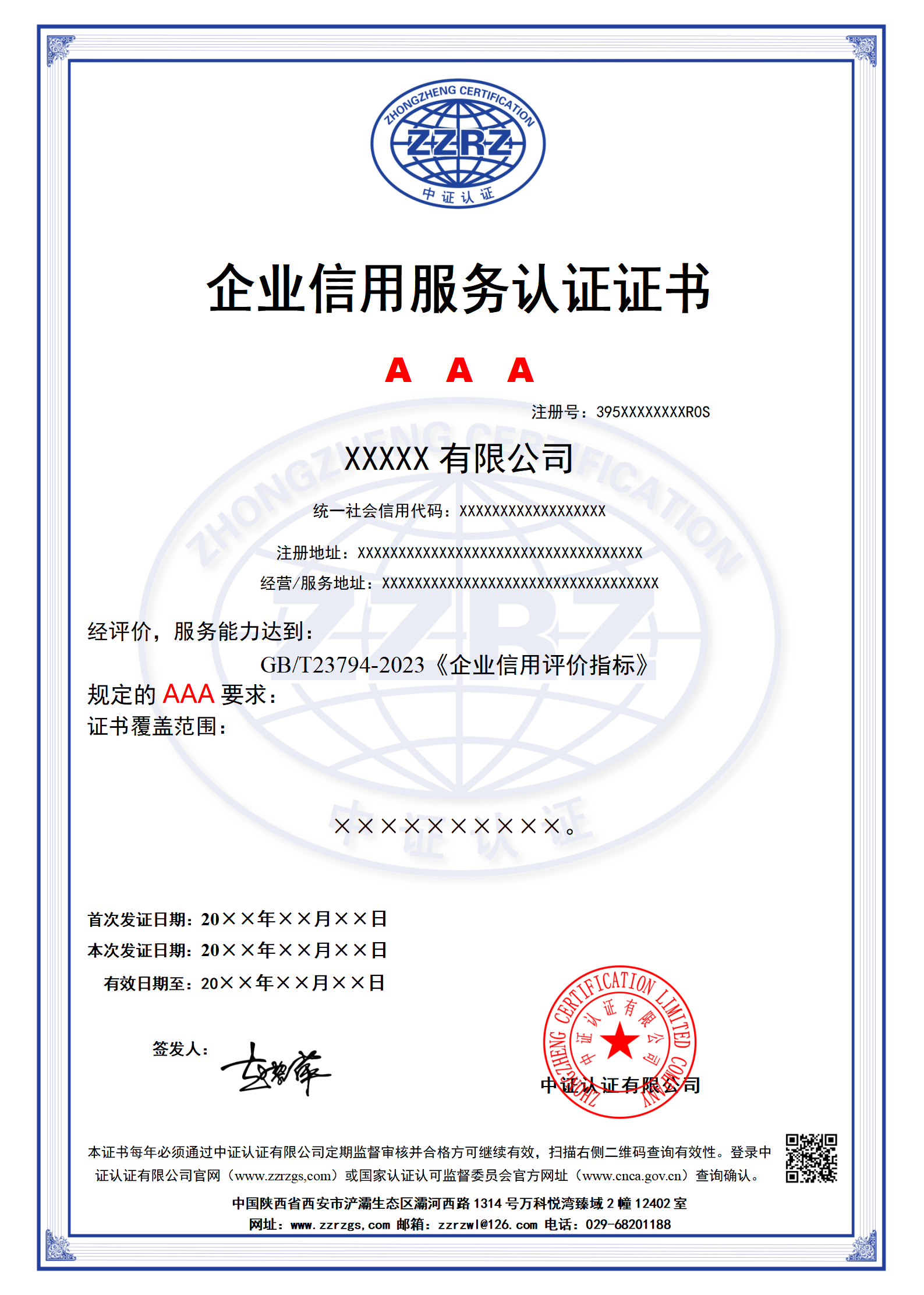 企业质量信用服务认证证书样本