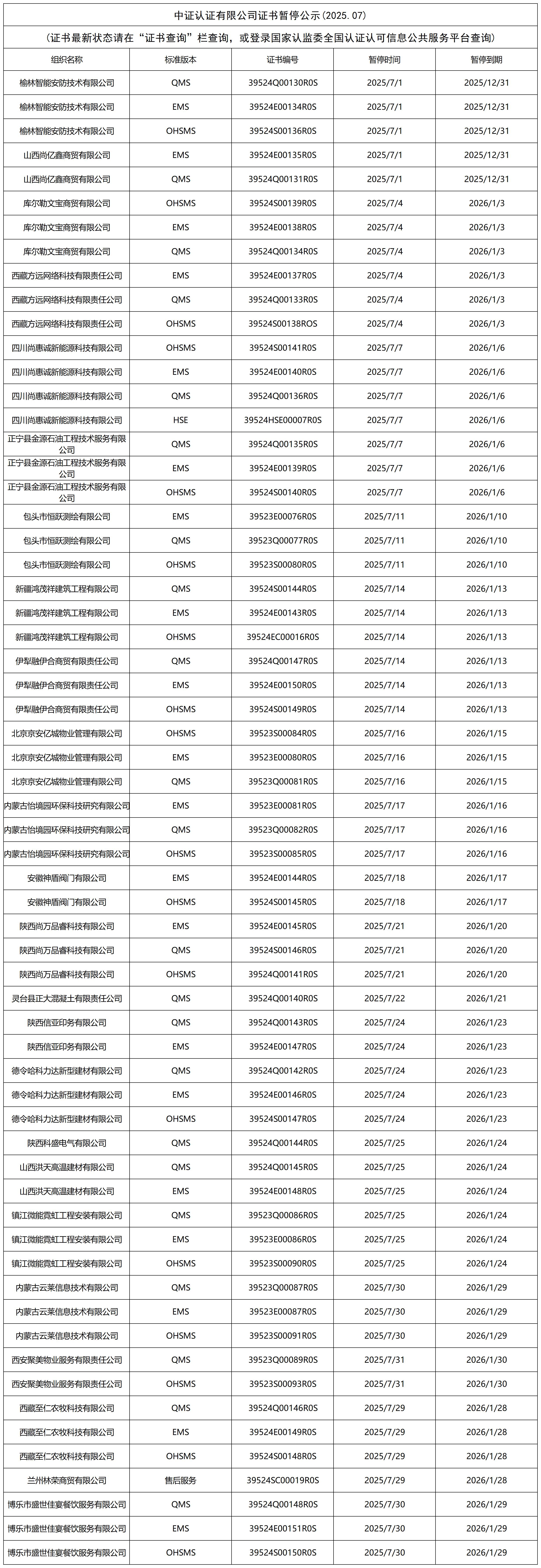 中证认证有限公司证书撤销公示(2025.07)