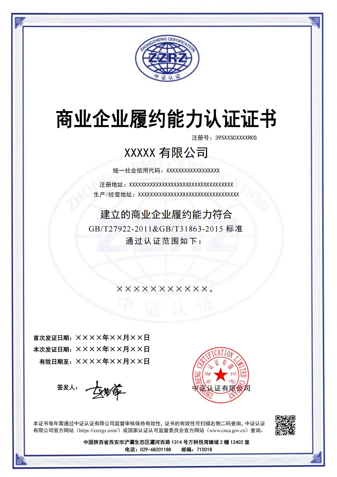 企业质量信用服务认证证书样本